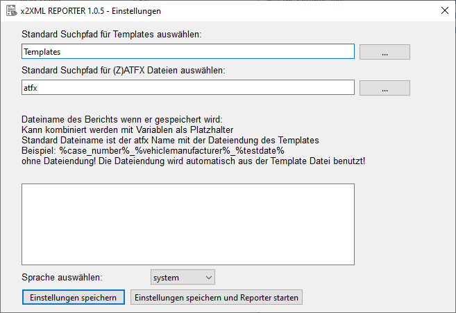 Die letzte Option setzt die Sprache des x2XML Reporters. Unterstützt werden bisher deutsch und englisch. Standardmäßig steht diese Option auf system, damit benutzt der x2XML Reporter die eingestellte Windows Sprache. Ist die Windows Sprache nicht deutsch, dann wird automatisch englisch benutzt. Sie können aber auch deutsch oder englisch erzwingen. Beispiel: Ihre Windows Sprache steht nicht auf deutsch, dann wäre der x2XML Reporter auf englisch. Sie möchten aber gerne das der x2XML Reporter auf deutsch ist, dann stellen sie die Option von system auf de. Nach einem Neustart der Einstellungen oder des x2XML Reporters wird die Oberfläche dann deutsch übersetzt sein.