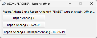 Nachdem der x2XML-Reporter den regulären Bericht und das RDASEP-Sheet erstellt hat, bietet er Ihnen am Schluss an, zu entscheiden, welche Dateien Sie öffnen möchten. Sie haben drei Optionen:
